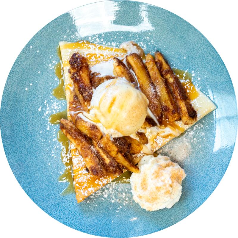 Choose your favorite classic topping: golden honey, granulated sugar, powdered sugar, or cinnamon sugar, all melted into rich butter and wrapped in a warm, delicate crepe. Finished with a light dusting of powdered sugar and served with a side of fluffy whipped cream.