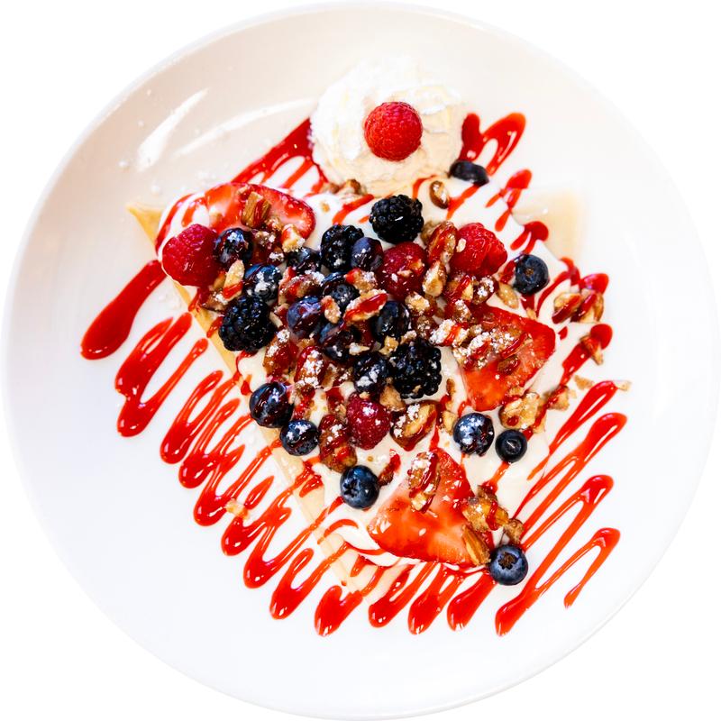 A light, powdered sugar crepe folded and topped with velvety house cream, a vibrant mix of fresh berries—blueberries, strawberries, blackberries, and raspberries. Candied almonds add a sweet crunch, while a drizzle of raspberry sauce ties it all together in perfect harmony. Finished with a dusting of powdered sugar and served with a side of fluffy whipped cream.