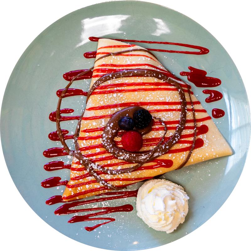 Crepe rolled with luscious mixed berry jam, then drizzled with rich dark chocolate and tangy raspberry sauce for the perfect balance of fruity and indulgent. Finished with a dusting of powdered sugar and served with a side of fluffy whipped cream.